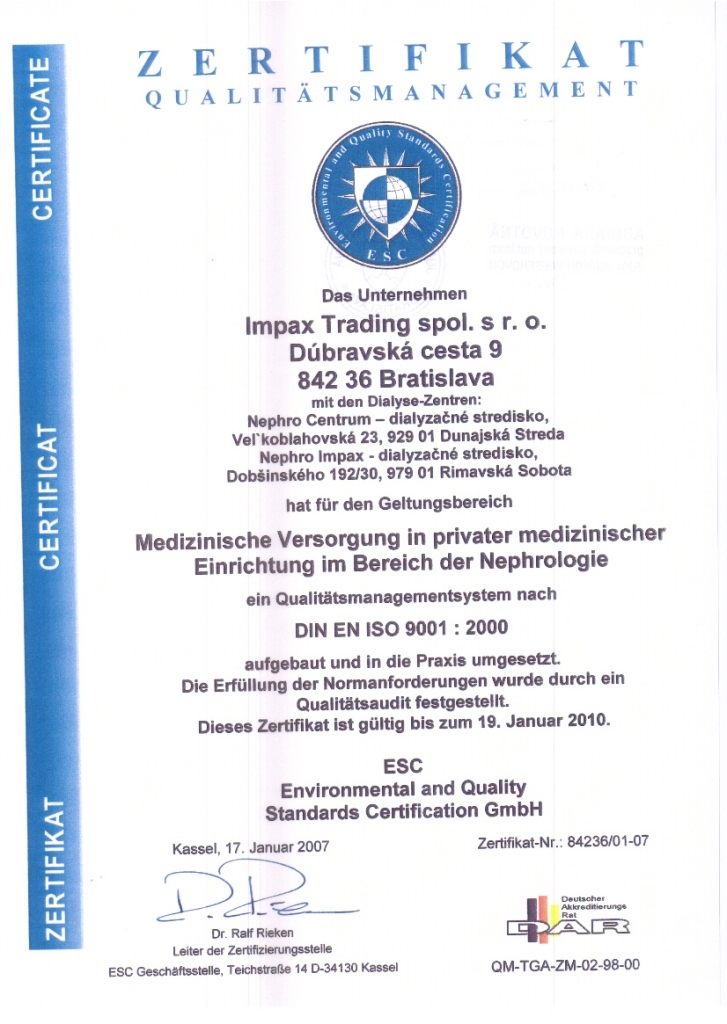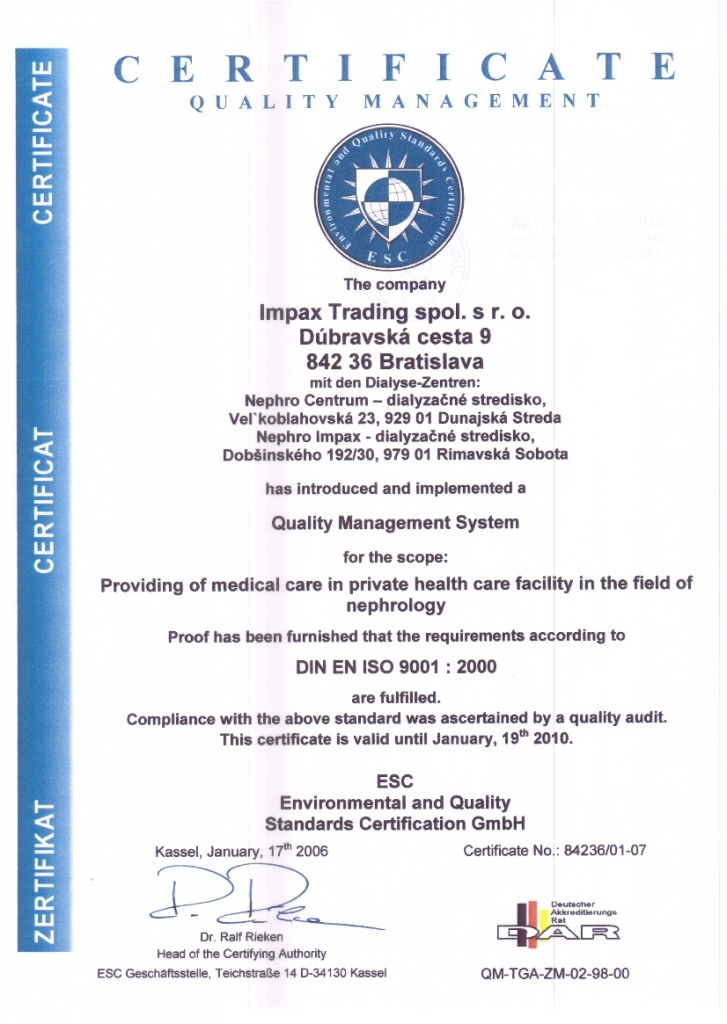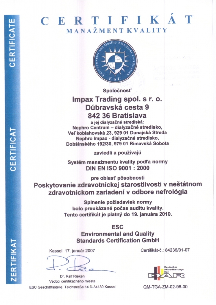 Spoločnosť Impax Trading, s. r. o. zaviedla a používa Systém manažmentu kvality podľa normy DIN EN ISO 9001:2000 pre oblasť pôsobnosti: Poskytovanie zdravotníckej starostlivosti v neštátnom zdravotníckom zariadení v odbore nefrológia.
